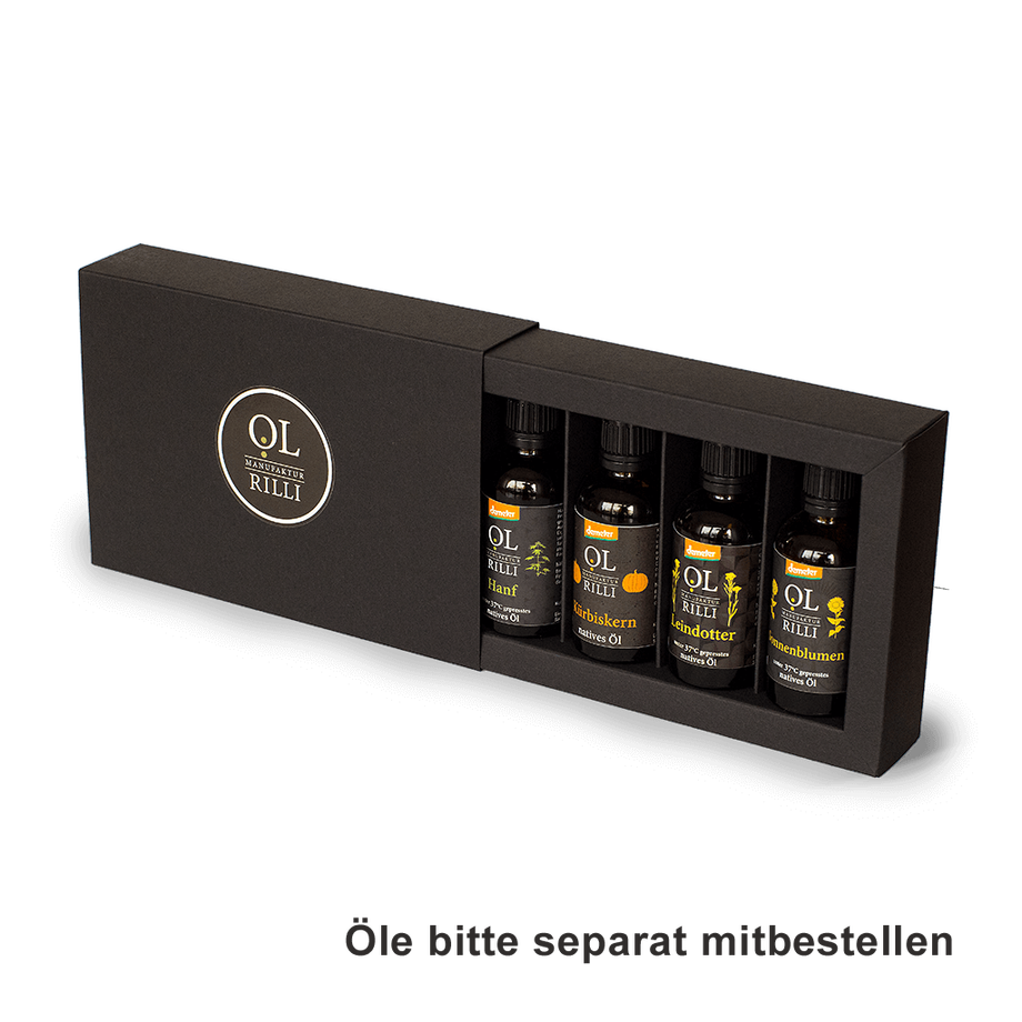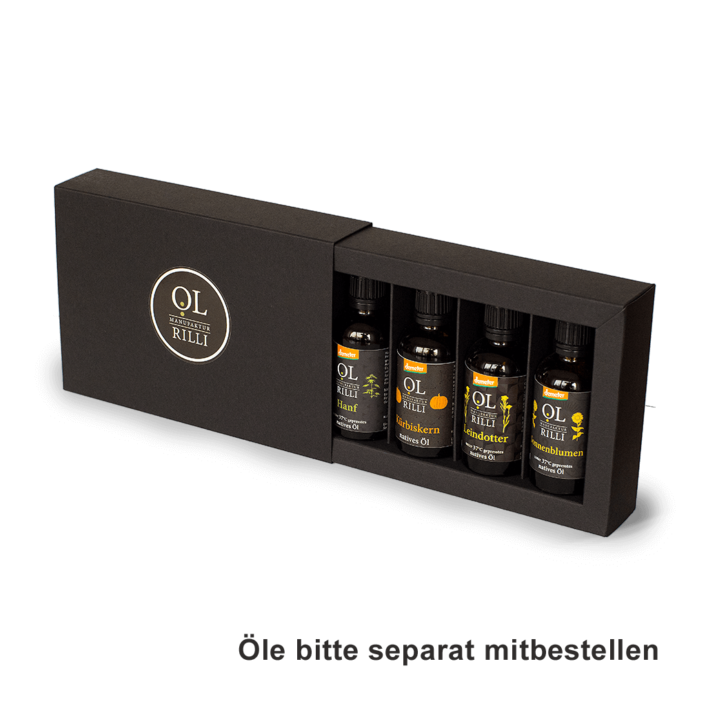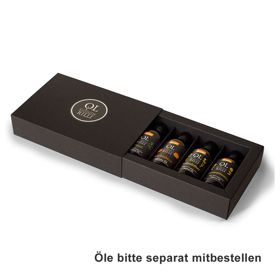 Zu dem Preis von 4,00 € für die Geschenkbox kommen noch die Preise für die jeweils ausgesuchten Öle dazu.