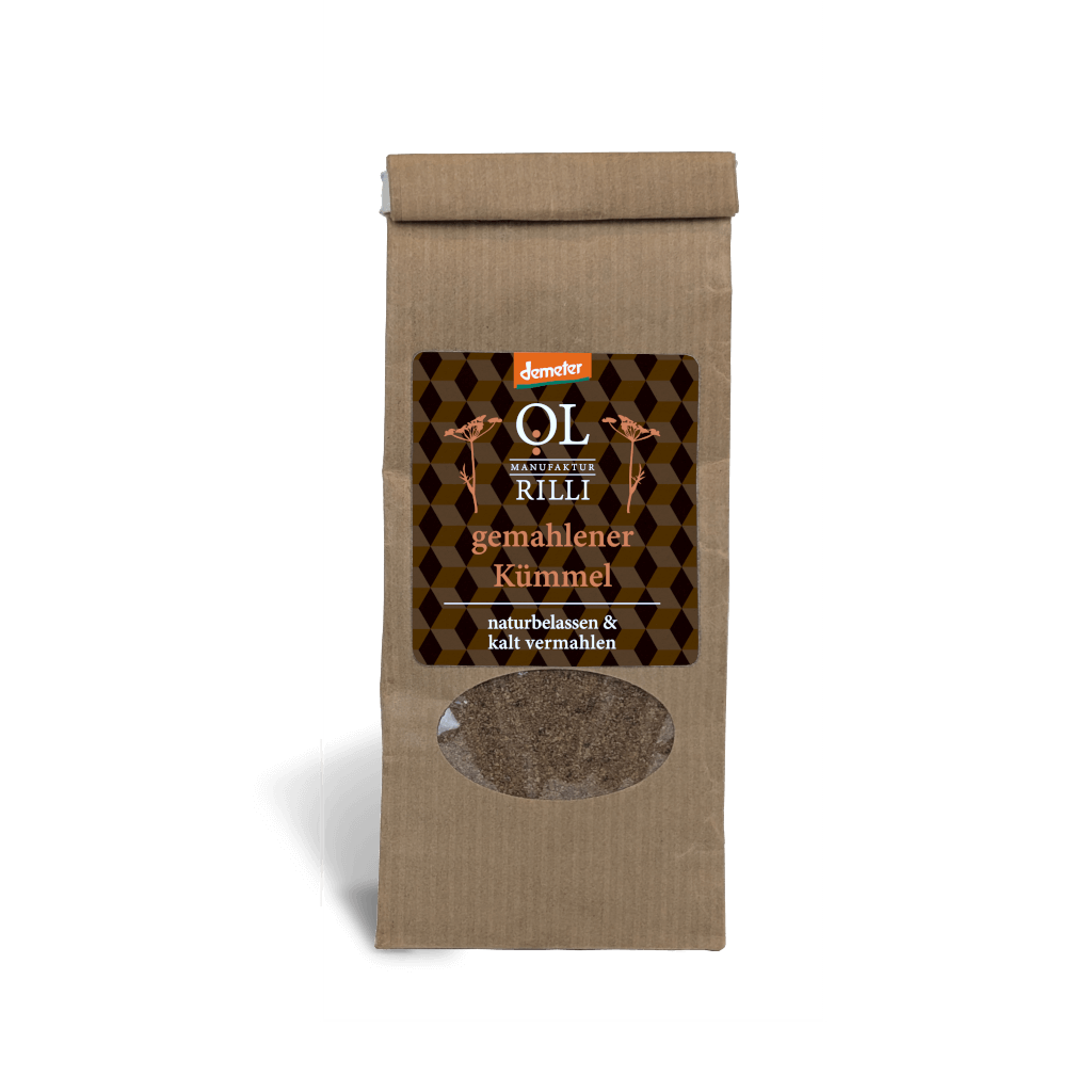 Kümmelsamen (gemahlen), eines der ältesten Gewürze, wird wegen seiner verdauungsfördernden Wirkung in schwer verdaulichen Speisen wie Kohlgerichten sowie in Kuchen, Roggenbrot, Gulasch, Käse und geschmorten Äpfeln verwendet.