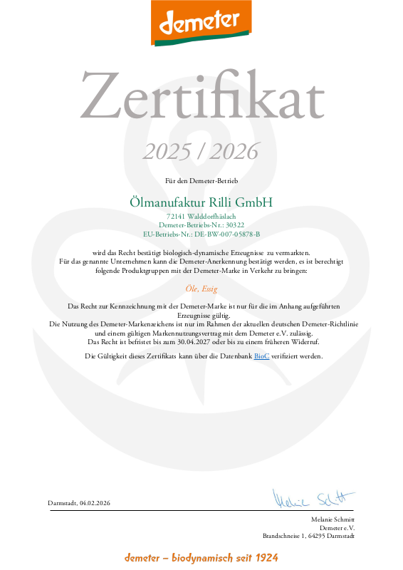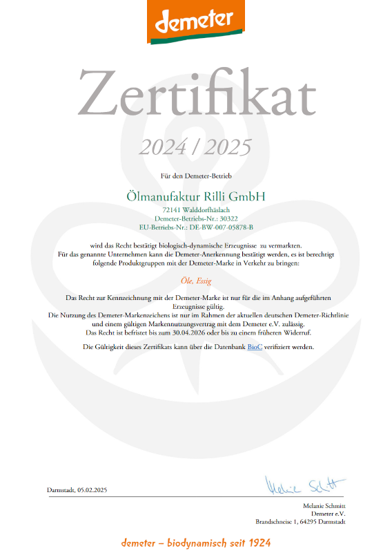 Diese Urkunde bestätigt, dass die Öle der Ölmanufaktur Rilli, nach den Demeter-Richtlinien (bio-dynamischen Qualität), herstellt werden. Warum die Ölmanufaktur Rilli auf Demeter setzt oder was überhaupt Demeter ist, erfahren Sie auf der Seite "Warum Demeter?".