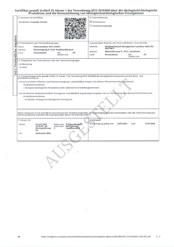 Die Öko-Kontrollstelle zertifiziert, dass die Öle der Ölmanufaktur Rilli ökologisch/biologisch erzeugt werden. Unsere Öko-Kontrollstelle: DE-ÖKO-007 = Prüfverein Verarbeitung ökologische Landbauprodukte e.V.