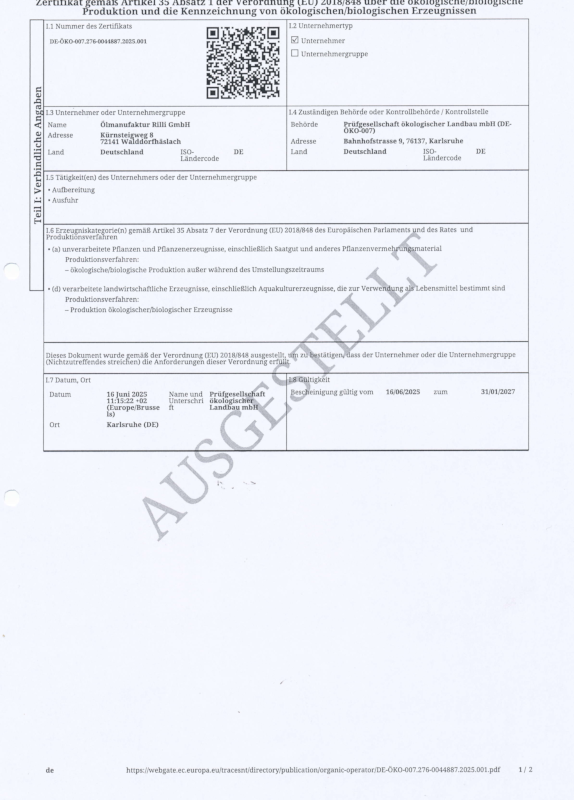 Bei der Ölmanufaktur Rilli legen wir Wert auf Transparenz, Qualität und sichere Herstellungsprozesse. Deshalb finden Sie hier eine Übersicht unserer Zertifikate – von Demeter über Bio bis hin zu Nachweisen zur Verpackung und Produktsicherheit. Alle Dokumente stehen Ihnen als Download zur Verfügung.