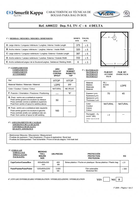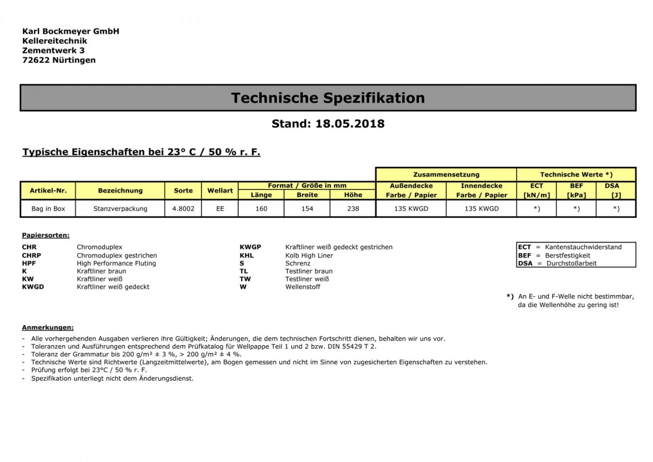 Technische Spezifikation Bag in Box Kartons